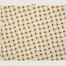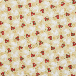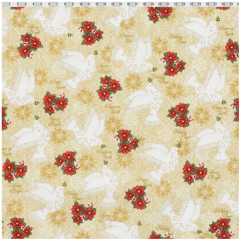 Een cremekleurige katoen met witte duiven, rode bloemen en teksten als "Peace on earth".